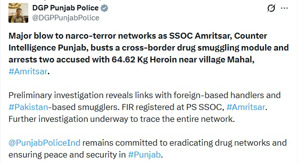 ਪੰਜਾਬ ਪੁਲਿਸ ਨੇ ਸਪੱਸ਼ਟ ਕੀਤਾ ਹੈ ਕਿ ਸੂਬੇ ਵਿੱਚ ਨਸ਼ੀਲੇ ਪਦਾਰਥਾਂ ਦੀ ਤਸਕਰੀ ਵਿਰੁੱਧ ਜ਼ੀਰੋ-ਟੌਲਰੈਂਸ ਨੀਤੀ ਅਪਣਾਈ ਗਈ ਹੈ। ਪੁਲਿਸ ਨੌਜਵਾਨਾਂ ਨੂੰ ਨਸ਼ਿਆਂ ਦੇ ਚੁੰਗਲ ਤੋਂ ਬਚਾਉਣ ਅਤੇ ਰਾਜ ਵਿੱਚ ਸ਼ਾਂਤੀ ਅਤੇ ਸੁਰੱਖਿਆ ਨੂੰ ਯਕੀਨੀ ਬਣਾਉਣ ਲਈ ਅਜਿਹੇ ਨੈੱਟਵਰਕਾਂ ਨੂੰ ਖਤਮ ਕਰਨ ਲਈ ਲਗਾਤਾਰ ਸਖ਼ਤ ਕਾਰਵਾਈ ਕਰ ਰਹੀ ਹੈ।