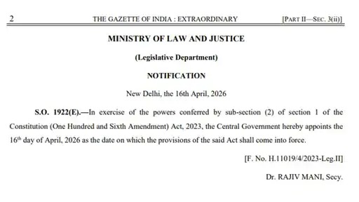 33% ਮਹਿਲਾ ਰਾਖਵਾਂਕਰਨ ਕਾਨੂੰਨ ਦੇਸ਼ ਭਰ ‘ਚ ਹੋਇਆ ਲਾਗੂ, ਸਰਕਾਰ ਨੇ ਜਾਰੀ ਕੀਤਾ ਨੋਟੀਫਿਕੇਸ਼ਨ