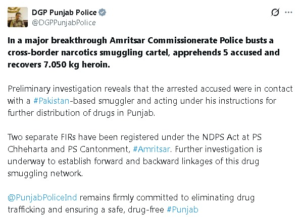 ਅੰਮ੍ਰਿਤਸਰ ‘ਚ ਕਰੋੜਾਂ ਦੀ ਹੈਰੋਇਨ ਸਣੇ 5 ਤਸਕਰ ਕਾਬੂ, ਪਾਕਿਸਤਾਨੀ ਸਮਗਲਰਾਂ ਨਾਲ ਜੁੜੇ ਤਾਰ