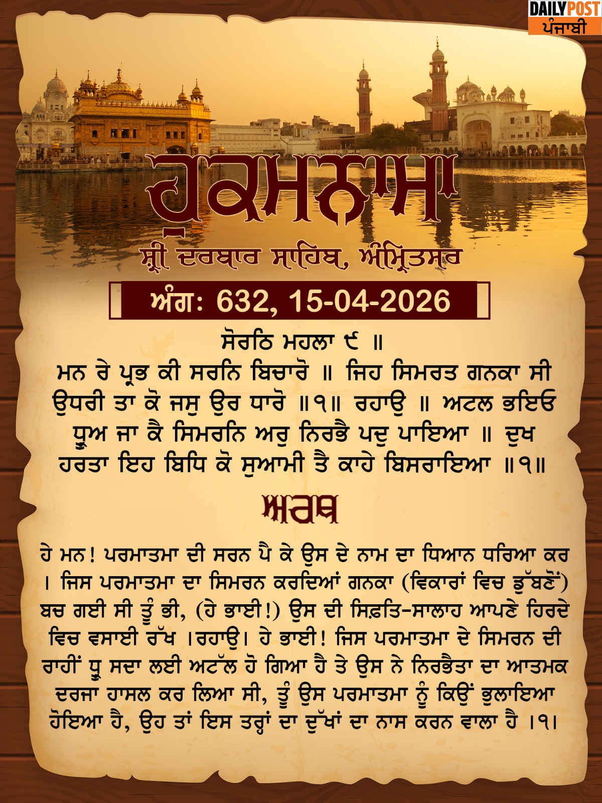 ਸ੍ਰੀ ਦਰਬਾਰ ਸਾਹਿਬ ਤੋਂ ਅੱਜ ਦਾ ਹੁਕਮਨਾਮਾ 15-4-2026
