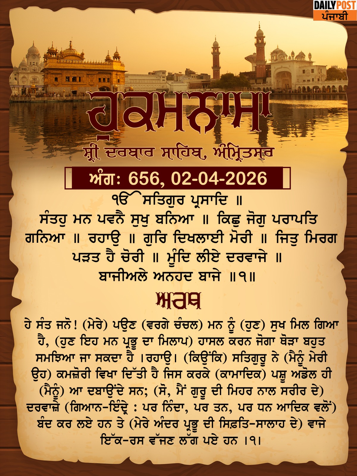 ਸ੍ਰੀ ਦਰਬਾਰ ਸਾਹਿਬ ਤੋਂ ਅੱਜ ਦਾ ਹੁਕਮਨਾਮਾ 2-4-2026