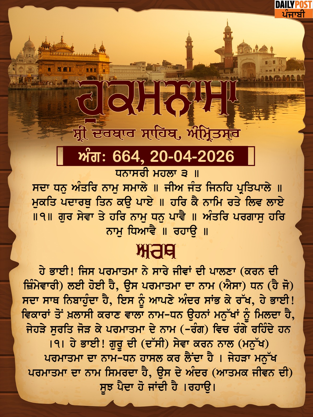 ਸ੍ਰੀ ਦਰਬਾਰ ਸਾਹਿਬ ਤੋਂ ਅੱਜ ਦਾ ਹੁਕਮਨਾਮਾ 20-4-2026