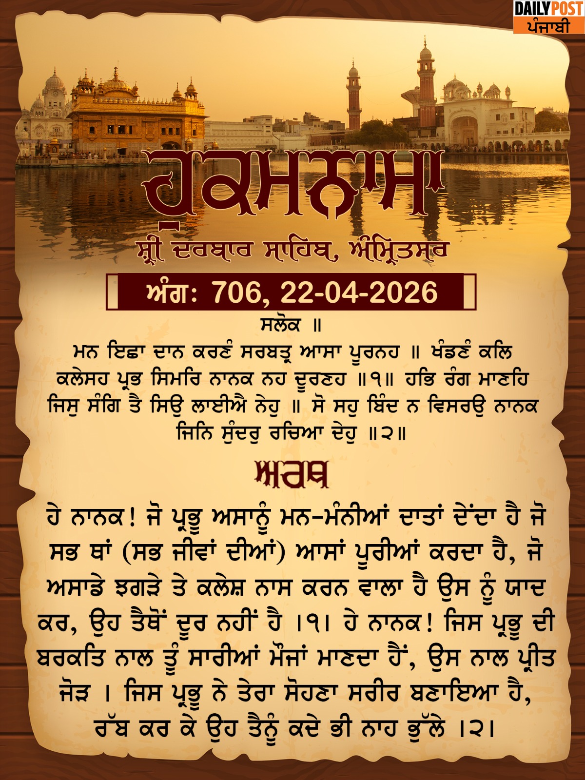 ਸ੍ਰੀ ਦਰਬਾਰ ਸਾਹਿਬ ਤੋਂ ਅੱਜ ਦਾ ਹੁਕਮਨਾਮਾ 22-4-2026