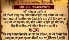 Jaitsaree Mahalaa 4 Ghar 1 Choupade : One Universal Creator God. By The Grace Of The True Guru: The Jewel of the Lord’s Name abides within my heart; the Guru has placed His hand on my forehead. The sins and pains of countless incarnations have been cast out. The Guru has blessed me with the Naam, the Name of the Lord, and my debt has been paid off. ||1|| O my mind, vibrate the Lord’s Name, and all your affairs shall be resolved. The Perfect Guru has implanted the Lord’s Name within me; without the Name, life is useless. || Pause || Without the Guru, the self-willed manmukhs are foolish and ignorant; they are forever entangled in emotional attachment to Maya. They never serve the feet of the Holy; their lives are totally useless. ||2|| Those who serve at the feet of the Holy, the feet of the Holy, their lives are made fruitful, and they belong to the Lord. Make me the slave of the slave of the slaves of the Lord; bless me with Your Mercy, O Lord of the Universe. ||3|| I am blind, ignorant and totally without wisdom; how can I walk on the Path ? I am blind – O Guru, please let me grasp the hem of Your robe, so that Daas Nanak Ji may walk in harmony with You. ||4||1||