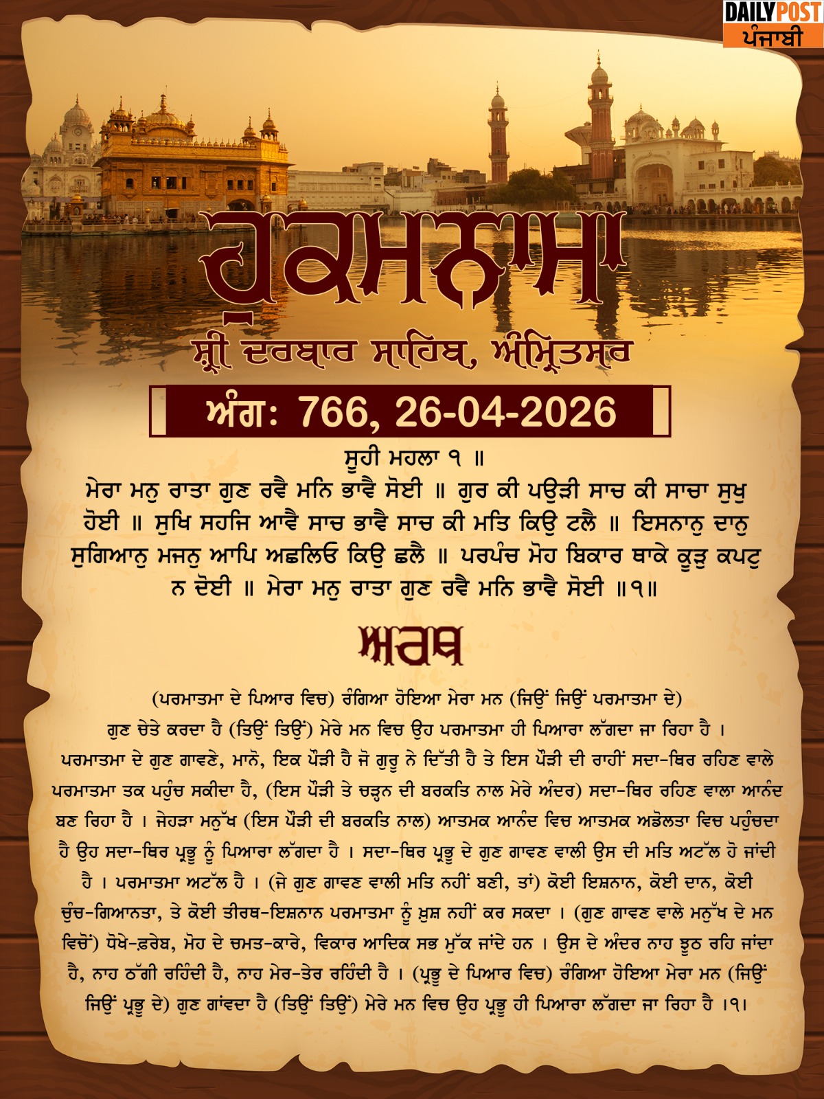 ਸ੍ਰੀ ਦਰਬਾਰ ਸਾਹਿਬ ਤੋਂ ਅੱਜ ਦਾ ਹੁਕਮਨਾਮਾ 26-4-2026