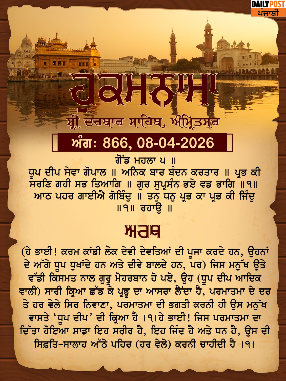ਸ੍ਰੀ ਦਰਬਾਰ ਸਾਹਿਬ ਤੋਂ ਅੱਜ ਦਾ ਹੁਕਮਨਾਮਾ 8-4-2026