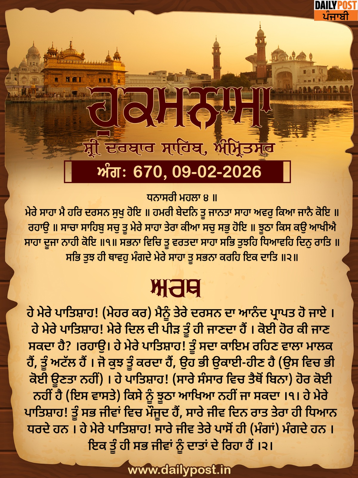 ਸ੍ਰੀ ਦਰਬਾਰ ਸਾਹਿਬ ਤੋਂ ਅੱਜ ਦਾ ਹੁਕਮਨਾਮਾ