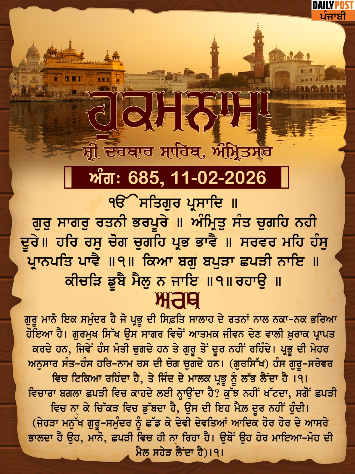 ਸ੍ਰੀ ਦਰਬਾਰ ਸਾਹਿਬ ਤੋਂ ਅੱਜ ਦਾ ਹੁਕਮਨਾਮਾ
