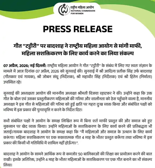 ਬਾਲੀਵੁੱਡ ਸਿੰਗਰ-ਰੈਪਰ ਬਾਦਸ਼ਾਹ ਨੇ “ਟੇਟੀਰੀ” ਗਾਣੇ ਨੂੰ ਲੈ ਕੇ ਚੱਲ ਰਹੇ ਵਿਵਾਦ ਦੇ ਸਬੰਧ ਵਿੱਚ ਰਾਸ਼ਟਰੀ ਮਹਿਲਾ ਕਮਿਸ਼ਨ (NCW) ਦੇ ਸਾਹਮਣੇ ਪੇਸ਼ ਹੋਣ ਤੋਂ ਬਾਅਦ ਮੁਆਫੀ ਮੰਗ ਲਈ ਹੈ। ਸਿੰਗਰ ਤੋਂ ਇਲਾਵਾ ਨਿਰਦੇਸ਼ਕ ਜੋਬਨ ਸੰਧੂ, ਮਹਾਵੀਰ ਸਿੰਘ ਦੇ ਨਾਲ-ਨਾਲ ਨਿਰਮਾਤਾ ਹਿਤੇਨ ਵੀ ਪੇਸ਼ ਹੋਏ।