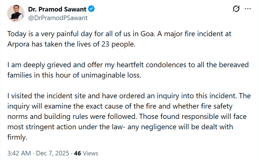 ਗੋਆ ‘ਚ ਵੱਡਾ ਹਾਦਸਾ, ਨਾਈਟ ਕਲੱਬ ‘ਚ ਲੱਗੀ ਭਿਆਨਕ ਅੱਗ, 23 ਲੋਕਾਂ ਦੀ ਮੌਤ