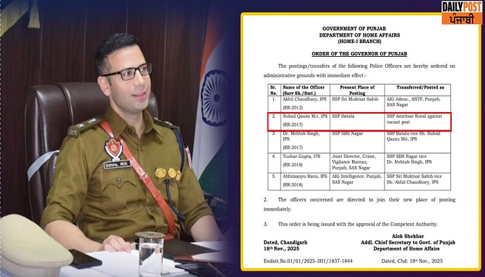 ਪੰਜਾਬ ਸਰਕਾਰ ਨੇ ਪੁਲਿਸ ਵਿੱਚ ਵੱਡਾ ਫੇਰਬਦਲ ਕੀਤਾ ਹੈ ਅਤੇ ਚਾਰ ਜ਼ਿਲ੍ਹਿਆਂ ਵਿੱਚ ਨਵੇਂ SSP ਨਿਯੁਕਤ ਕੀਤੇ ਹਨ। ਇਨ੍ਹਾਂ ਵਿੱਚੋਂ ਅੰਮ੍ਰਿਤਸਰ ਦਿਹਾਤੀ ਵਿੱਚ ਇੱਕ ਨਵਾਂ SSP ਨਿਯੁਕਤ ਕੀਤਾ ਗਿਆ ਹੈ, ਜਿੱਥੇ ਗੈਂਗਸਟਰਾਂ ਵਿਰੁੱਧ ਕਾਰਵਾਈ ਨਾ ਕਰਨ ਕਾਰਨ ਸਰਕਾਰ ਨੇ SSP ਨੂੰ ਸਸਪੈਂਡ ਕਰ ਦਿੱਤਾ ਸੀ।