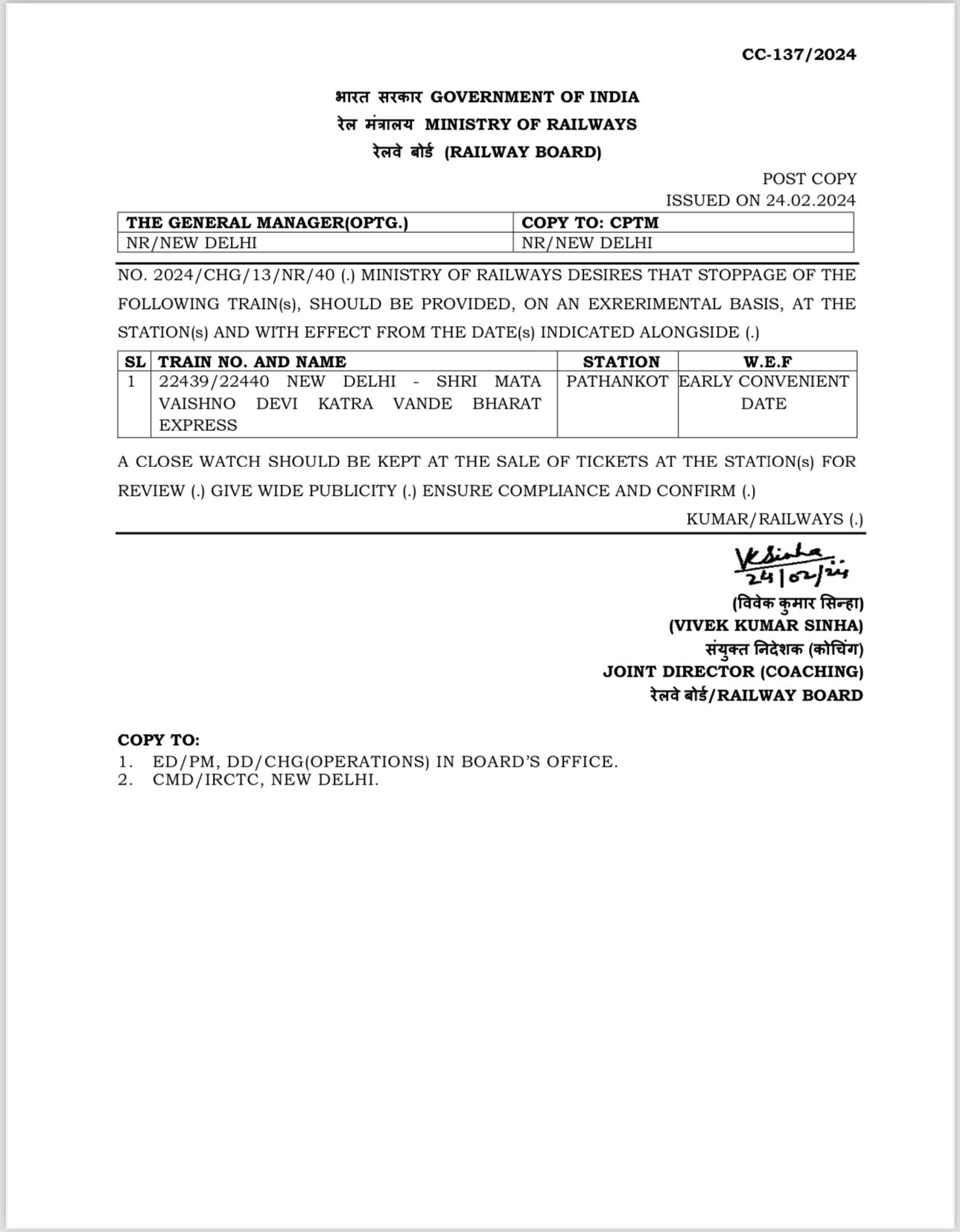 ਰੇਲਵੇ ਮੰਤਰਾਲੇ ਵੱਲੋਂ ਜਾਰੀ ਹੁਕਮਾਂ ਅਨੁਸਾਰ ਪਠਾਨਕੋਟ ਕੈਂਟ ਵਿਖੇ 22439/22440 ਦਾ ਸਟਾਪੇਜ ਬਣਾਇਆ ਗਿਆ ਹੈ। ਇਹ ਟਰੇਨ ਸਵੇਰੇ 6 ਵਜੇ ਦਿੱਲੀ ਤੋਂ ਰਵਾਨਾ ਹੁੰਦੀ ਹੈ, ਜੋ ਅੰਬਾਲਾ ਅਤੇ ਲੁਧਿਆਣਾ ਵਿਖੇ ਰੁਕਣ ਤੋਂ ਬਾਅਦ ਪਠਾਨਕੋਟ ਕੈਂਟ ਪਹੁੰਚੇਗੀ। 11:25 ‘ਤੇ ਪਠਾਨਕੋਟ ਕੈਂਟ ਤੋਂ ਬਾਅਦ ਦੁਪਹਿਰ 2 ਵਜੇ ਕਟੜਾ ਪਹੁੰਚੇਗੀ। ਵਾਪਸੀ ‘ਤੇ ਕਟੜਾ ਤੋਂ ਬਾਅਦ ਦੁਪਹਿਰ 3 ਵਜੇ 5:25 ‘ਤੇ ਪਠਾਨਕੋਟ ਕੈਂਟ ਤੋਂ ਹੁੰਦੇ ਹੋਏ 11 ਵਜੇ ਦਿੱਲੀ ਪਹੁੰਚੇਗੀ। ਇਸ ਨਾਲ ਦਿੱਲੀ ਜਾਣ ਵਾਲੇ ਕਾਰੋਬਾਰੀਆਂ ਦਾ ਸਮਾਂ ਬਚੇਗਾ।