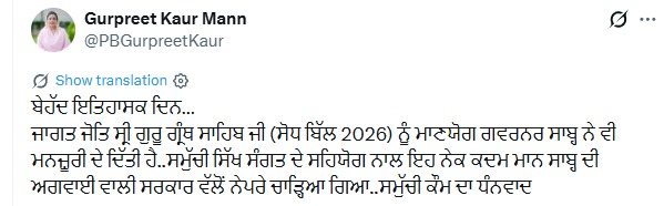 ਬੇਅਦਬੀ ਖਿਲਾਫ ਕਾਨੂੰਨ ਬਣਨ ’ਤੇ ਡਾ. ਗੁਰਪ੍ਰੀਤ ਮਾਨ ਨੇ ਟਵੀਟ ਕੀਤਾ ਤੇ ਰਾਜਪਾਲ ਗੁਲਾਬ ਚੰਦ ਕਟਾਰੀਆ ਦਾ ਧੰਨਵਾਦ ਕੀਤਾ। ਉਨ੍ਹਾਂ ਲਿਖਿਆ ਕਿ ਬਿੱਲ ‘ਤੇ ਦਸਤਖ਼ਤ ਕਰਕੇ ਮਨਜ਼ੂਰੀ ਦੇਣ ਲਈ ਗਵਰਨਰ ਦਾ ਧੰਨਵਾਦ। ਇਹ ਇੱਕ ਕਾਨੂੰਨ ਹੀ ਨਹੀਂ, ਸਾਡੀ ਆਸਥਾ ਲਈ ਵੀ ਵੱਡਾ ਕਦਮ ਹੈ।ਸਮੁੱਚੇ ਪੰਜਾਬੀਆਂ ਦੇ ਸਹਿਯੋਗ ਨਾਲ ਇਹ ਕਾਨੂੰਨ ਬਣਿਆ। ਹੁਣ ਕੋਈ ਬੇਅਦਬੀ ਕਰਨ ਬਾਰੇ ਸੋਚੇਗਾ ਵੀ ਨਹੀਂ।