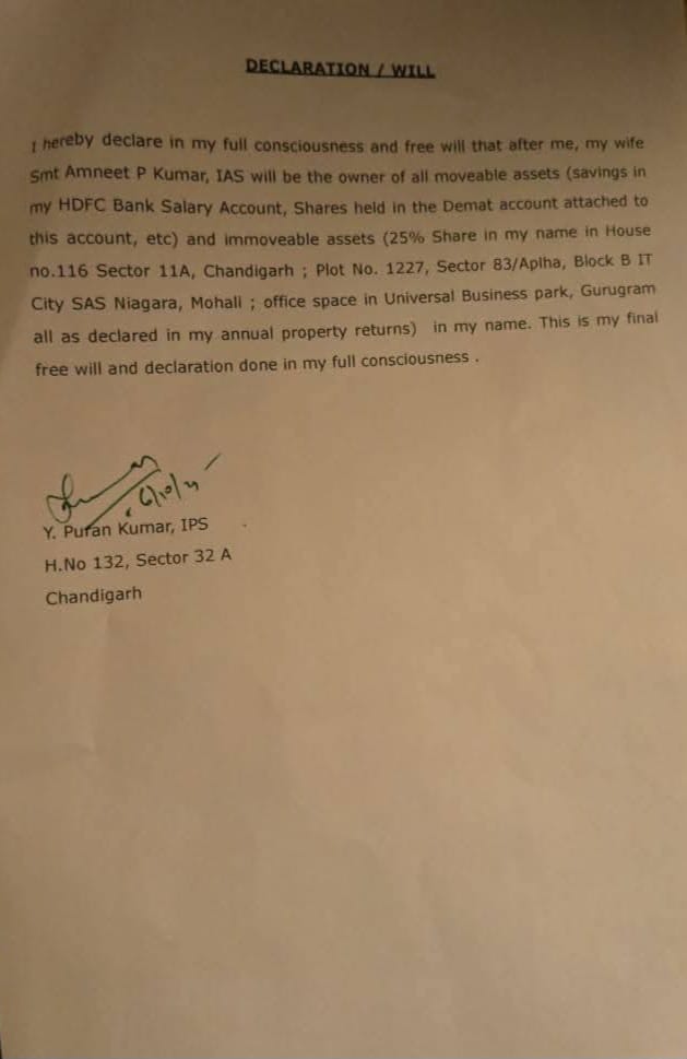 ਪੁਲਿਸ ਨੂੰ 8 ਪੰਨ੍ਹਿਆਂ ਦਾ ਇਕ ਨੋਟ ਬਰਾਮਦ ਹੋਇਆ ਹੈ ਜਿਸ ਵਿਚ ਕਈ ਅਧਿਕਾਰੀਆਂ ‘ਤੇ ਗੰਭੀਰ ਇਲਜ਼ਾਮ ਲਗਾਏ ਗਏ ਹਨ ਤੇ ਨਾਲ ਹੀ ADGP ਨੇ ਸਾਰੀ ਜਾਇਦਾਦ ਆਪਣੀ ਪਤਨੀ ਦੇ ਨਾਂ ਕਰ ਦਿੱਤੀ ਹੈ। ਲਗਾਤਾਰ ਪੁਲਿਸ ਵੱਲੋਂ ਇਸ ਮਾਮਲੇ ਦੀ ਗੰਭੀਰਤਾ ਨਾਲ ਜਾਂਚ ਕੀਤੀ ਜਾ ਰਹੀ ਹੈ। ਹੁਣ ਪੁਲਿਸ ਵੱਲੋਂ ਖੁਲਾਸਾ ਕੀਤਾ ਹੈ ਕਿ ਪੂਰਨ ਕੁਮਾਰ ਨੇ ਸਾਰੀ ਵਸੀਅਤ ਆਪਣੀ ਪਤਨੀ ਅਮਨੀਤ ਪੀ. ਕੁਮਾਰ ਦੇ ਨਾਂ ਕਰ ਦਿੱਤੀ ਹੈ।