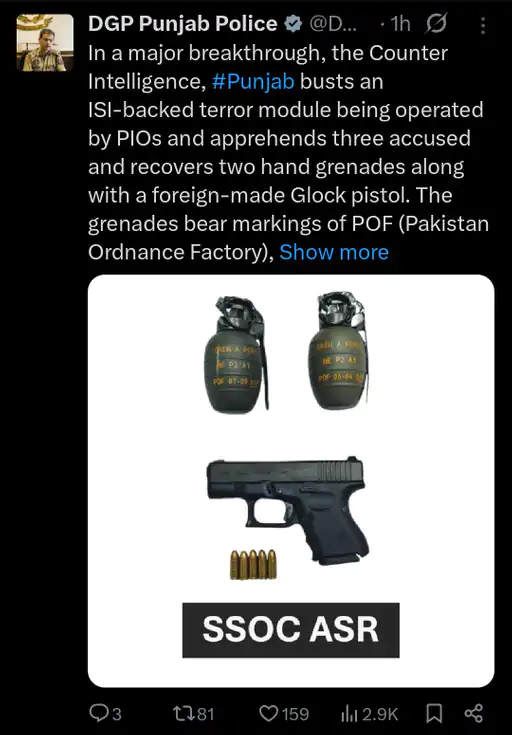 ਅੰਮ੍ਰਿਤਸਰ ਵਿਚ ISI ਸਮਰਥਿਤ ਅੱਤਵਾਦੀ ਮਾਡਿਊਲ ਦਾ ਪਰਦਾਫਾਸ਼, ਹੈਂਡ ਗ੍ਰਨੇਡ ਤੇ ਹਥਿਆਰਾਂ ਸਣੇ 3 ਦੋਸ਼ੀ ਕਾਬੂ