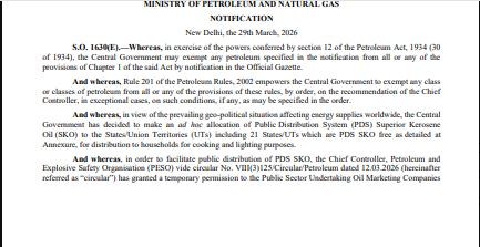 ਸਰਕਾਰ ਨੇ ਸਪਲਾਈ ਆਸਾਨ ਬਣਾਉਣ ਲਈ 60 ਦਿਨਾਂ ਲਈ ਜਨਤਕ ਵੰਡ ਪ੍ਰਣਾਲੀ ਦੇ ਨਿਯਮਾਂ ‘ਚ ਢਿੱਲ ਦਿੱਤੀ ਹੈ ਤਾਂ ਜੋ ਲੋੜਵੰਦ ਪਰਿਵਾਰਾਂ ਤਕ ਤੇਲ ਸਮੇਂ ‘ਤੇ ਪਹੁੰਚ ਸਕੇ। ਸਰਕਾਰ ਨੇ ਇਹ ਫੈਸਲਾ ਅਮਰੀਕਾ-ਇਜ਼ਰਾਈਲ ਦੇ ਈਰਾਨ ਸੰਘਰਸ਼ ਕਾਰਨ ਲਿਆ ਹੈ। ਮਿਡਲ ਈਸਟ ਵਿਚ ਜਾਰੀ ਜੰਗ ਕਾਰਨ ਭਾਰਤ ਵਿਚ ਗੈਸ, ਪੈਟਰੋਲ ਤੇ ਡੀਜ਼ਲ ਦੀ ਕਮੀ ਹੈ। ਕੇਂਦਰ ਸਰਕਾਰ ਲਗਾਤਾਰ ਮੌਜੂਦਾ ਹਾਲਤ ‘ਤੇ ਚਿੰਤਾ ਪ੍ਰਗਟਾ ਰਹੀ ਹੈ।