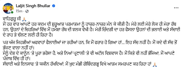 ਪਰ ਅੱਜ ਜਿਹੜੀਆਂ ਅਫਵਾਹਾਂ ਫੈਲਾਈਆਂ ਜਾ ਰਹੀਆਂ ਹਨ ਕਿ ਮੈਂ ਫਰਾਰ ਹੋ ਗਿਆ ਹਾਂ..ਇਹ ਸੱਚ ਨਹੀਂ ਹੈ। ਮੈਂ ਕਦੇ ਵੀ ਸੱਚ ਤੋਂ ਭੱਜਣ ਵਾਲਾ ਨਹੀਂ ਹਾਂ। ਮੈਨੂੰ ਦੇਸ਼ ਦੇ ਕਾਨੂੰਨ ‘ਤੇ ਪੂਰਾ ਭਰੋਸਾ ਹੈ ਤੇ ਨਿਆਂ ਪ੍ਰਣਾਲੀ ‘ਤੇ ਵੀ ਅਟੱਲ ਵਿਸ਼ਵਾਸ ਹੈ। ਮੈਂ ਕਿਤੇ ਵੀ ਨਹੀਂ ਭੱਜਿਆ ਮੈਂ ਆਪਣੇ ਪੰਜਾਬ ਵਿਚ ਹੀ ਹਾਂ। ਸੱਚਾਈ ਤੇ ਇਨਸਾਫ ‘ਤੇ ਯਕੀਨ ਰੱਖਦਿਆਂ ਮੈਂ ਖੁਦ ਮੰਡੀ ਗੋਬਿੰਦਗੜ੍ਹ ਵਿਖੇ ਆਤਮ ਸਮਰਪਣ ਕਰ ਰਿਹਾ ਹਾਂ।