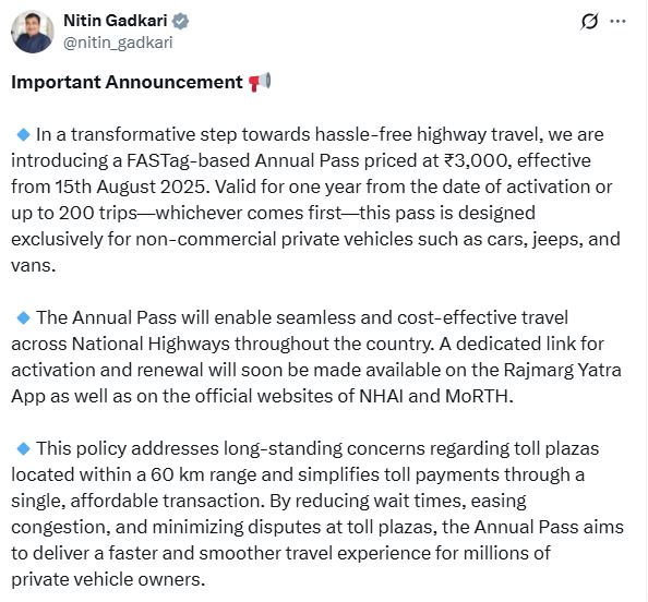 ਨਿਤਿਨ ਗਡਕਰੀ ਨੇ ‘X’ ‘ਤੇ ਲਿਖਿਆ, ‘ਇੱਕ ਇਤਿਹਾਸਕ ਪਹਿਲਕਦਮੀ ਵਿੱਚ, ₹ 3,000 ਦਾ FASTag ਅਧਾਰਤ ਸਾਲਾਨਾ ਪਾਸ 15 ਅਗਸਤ 2025 ਤੋਂ ਸ਼ੁਰੂ ਕੀਤਾ ਜਾ ਰਿਹਾ ਹੈ। ਇਹ ਪਾਸ ਐਕਟੀਵੇਸ਼ਨ ਦੀ ਮਿਤੀ ਤੋਂ ਇੱਕ ਸਾਲ ਜਾਂ 200 ਯਾਤਰਾਵਾਂ ਤੱਕ, ਜੋ ਵੀ ਪਹਿਲਾਂ ਹੋਵੇ, ਲਈ ਵੈਧ ਹੋਵੇਗਾ। ਇਹ ਪਾਸ ਵਿਸ਼ੇਸ਼ ਤੌਰ ‘ਤੇ ਸਿਰਫ਼ ਗੈਰ-ਵਪਾਰਕ ਨਿੱਜੀ ਵਾਹਨਾਂ (ਕਾਰਾਂ, ਜੀਪਾਂ, ਵੈਨਾਂ ਆਦਿ) ਲਈ ਤਿਆਰ ਕੀਤਾ ਗਿਆ ਹੈ। ਇਹ ਦੇਸ਼ ਭਰ ਦੇ ਰਾਸ਼ਟਰੀ ਰਾਜਮਾਰਗਾਂ ‘ਤੇ ਨਿਰਵਿਘਨ ਯਾਤਰਾ ਨੂੰ ਸੰਭਵ ਬਣਾਏਗਾ।’