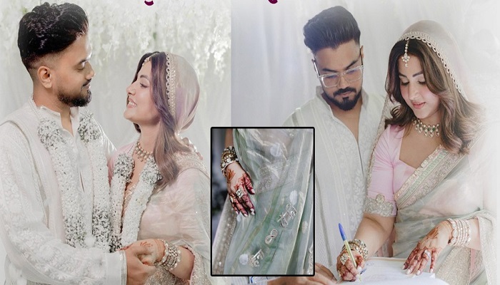 ਸਾਹਮਣੇ ਆਈਆਂ ਤਸਵੀਰਾਂ ਵਿੱਚ, ਹਿਨਾ ਖਾਨ ਅਤੇ ਰੌਕੀ ਜੈਸਵਾਲ ਇਕੱਠੇ ਖੜ੍ਹੇ ਦਿਖਾਈ ਦੇ ਰਹੇ ਹਨ। ਰੌਕੀ ਨੇ ਚਿੱਟਾ ਕੁੜਤਾ-ਪਜਾਮਾ ਪਾਇਆ ਹੈ। ਇਸ ਦੇ ਨਾਲ ਹੀ, ਹਿਨਾ ਖਾਨ ਨੇ ਹਲਕੇ ਹਰੇ ਰੰਗ ਦੀ ਰਾਅ ਸਿਲਕ ਸਾੜੀ ਪਾਈ ਹੋਈ ਹੈ।