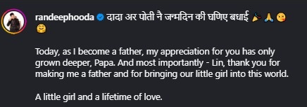 ਰਣਦੀਪ ਨੇ ਆਪਣੀ ਸੋਸ਼ਲ ਮੀਡੀਆ ਪੋਸਟ ਵਿੱਚ ਵੀ ਇਸ ਗੱਲ ਦਾ ਜ਼ਿਕਰ ਕੀਤਾ। ਉਨ੍ਹਾਂ ਨੇ ਦੋ ਫੋਟੋਆਂ ਸਾਂਝੀਆਂ ਕੀਤੀਆਂ। ਪਹਿਲੀ ਫੋਟੋ ਵਿੱਚ ਰਣਦੀਪ ਦੇ ਪਿਤਾ ਆਪਣੀ ਪੋਤੀ ਨੂੰ ਫੜੇ ਹੋਏ ਦਿਖਾਈ ਦੇ ਰਹੇ ਹਨ, ਜਦੋਂ ਕਿ ਦੂਜੀ ਫੋਟੋ ਵਿੱਚ ਉਨ੍ਹਾਂ ਦੀ ਧੀ ਦਾ ਛੋਟਾ ਜਿਹਾ ਹੱਥ ਦਿਖਾਈ ਦੇ ਰਿਹਾ ਹੈ।