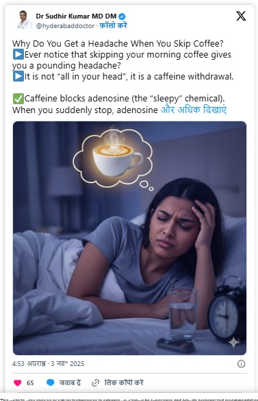 ਸਾਡੀ ਚਾਹ ਅਤੇ ਕੌਫੀ ਵਿੱਚ ਕੈਫੀਨ ਦਿਮਾਗ ਵਿੱਚ ਪੈਦਾ ਹੋਣ ਵਾਲੇ ਰਸਾਇਣ ਐਡੀਨੋਸਿਨ ਨੂੰ ਬਲੌਕ ਕਰਦਾ ਹੈ। ਐਡੀਨੋਸਿਨ ਉਹੀ ਕੈਮੀਕਲ ਹੈ ਜੋ ਸਾਨੂੰ ਨੀਂਦ ਅਤੇ ਥਕਾਵਟ ਮਹਿਸੂਸ ਕਰਵਾਉਂਦਾ ਹੈ। ਜਦੋਂ ਤੁਸੀਂ ਰੋਜ਼ਾਨਾ ਕੌਫੀ ਪੀਂਦੇ ਹੋ, ਤਾਂ ਤੁਹਾਡਾ ਦਿਮਾਗ ਇਸ ਬਦਲਾਅ ਦਾ ਆਦੀ ਹੋ ਜਾਂਦਾ ਹੈ, ਪਰ ਜਿਵੇਂ ਹੀ ਤੁਸੀਂ ਕੌਫੀ ਜਾਂ ਚਾਹ ਪੀਣਾ ਬੰਦ ਕਰਦੇ ਹੋ, ਐਡੀਨੋਸਿਨ ਅਚਾਨਕ ਜ਼ਿਆਦਾ ਮਾਤਰਾ ਵਿੱਚ ਸਰਗਰਮ ਹੋ ਜਾਂਦਾ ਹੈ। ਇਸ ਨਾਲ ਦਿਮਾਗ ਵਿੱਚ ਖੂਨ ਦੀਆਂ ਨਾੜੀਆਂ ਫੈਲ ਜਾਂਦੀਆਂ ਹਨ, ਜਿਸ ਨਾਲ ਸਿਰ ਦਰਦ ਹੁੰਦਾ ਹੈ।