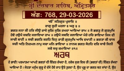 ਸ੍ਰੀ ਦਰਬਾਰ ਸਾਹਿਬ ਤੋਂ ਅੱਜ ਦਾ ਹੁਕਮਨਾਮਾ 29-3-2026