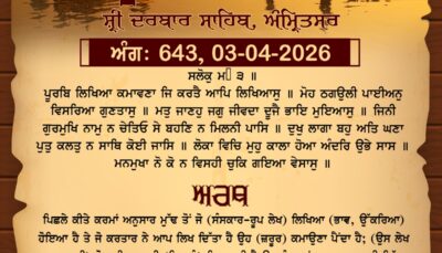 ਸ੍ਰੀ ਦਰਬਾਰ ਸਾਹਿਬ ਤੋਂ ਅੱਜ ਦਾ ਹੁਕਮਨਾਮਾ 3-4-2026