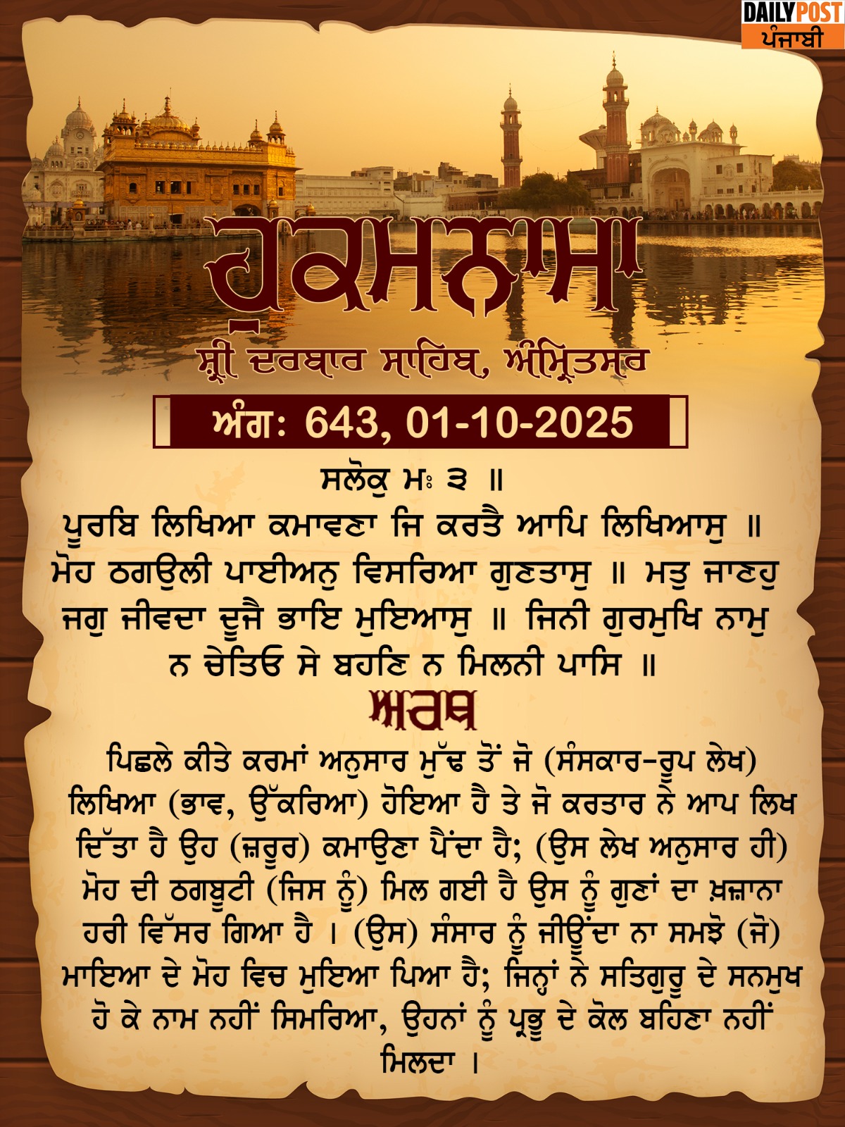 ਸ੍ਰੀ ਦਰਬਾਰ ਸਾਹਿਬ ਤੋਂ ਅੱਜ ਦਾ ਹੁਕਮਨਾਮਾ 1-10-2025