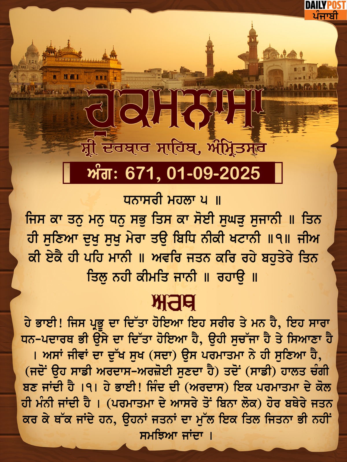 ਸ੍ਰੀ ਦਰਬਾਰ ਸਾਹਿਬ ਤੋਂ ਅੱਜ ਦਾ ਹੁਕਮਨਾਮਾ 1-9-2025