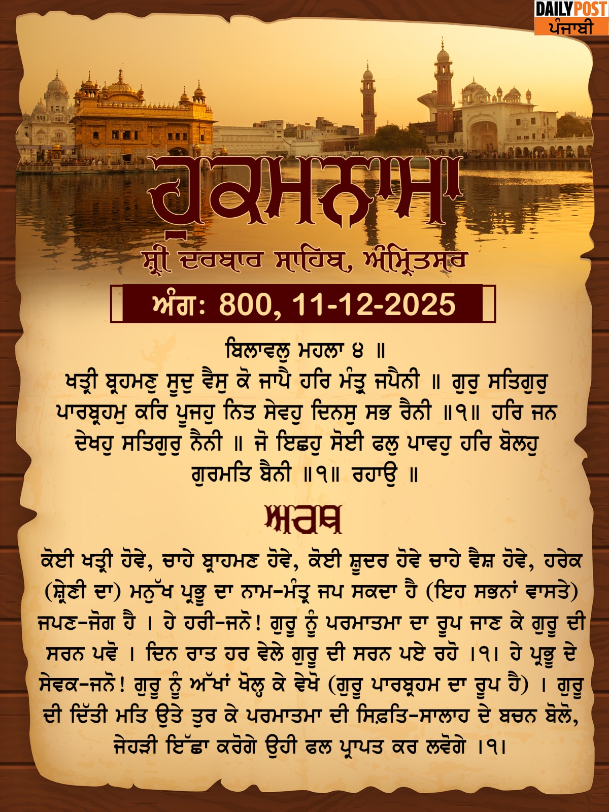 ਸ੍ਰੀ ਦਰਬਾਰ ਸਾਹਿਬ ਤੋਂ ਅੱਜ ਦਾ ਹੁਕਮਨਾਮਾ 11-12-2025