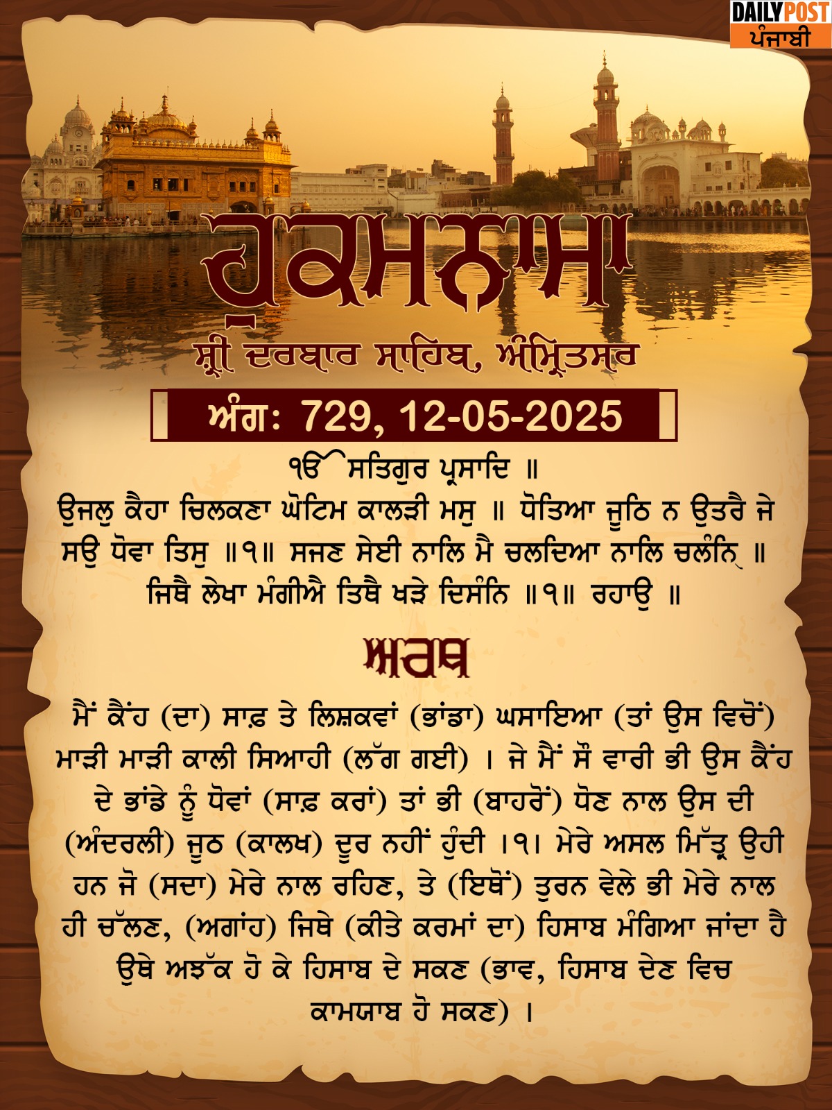ਸ੍ਰੀ ਦਰਬਾਰ ਸਾਹਿਬ ਤੋਂ ਅੱਜ ਦਾ ਹੁਕਮਨਾਮਾ 12-5-2025