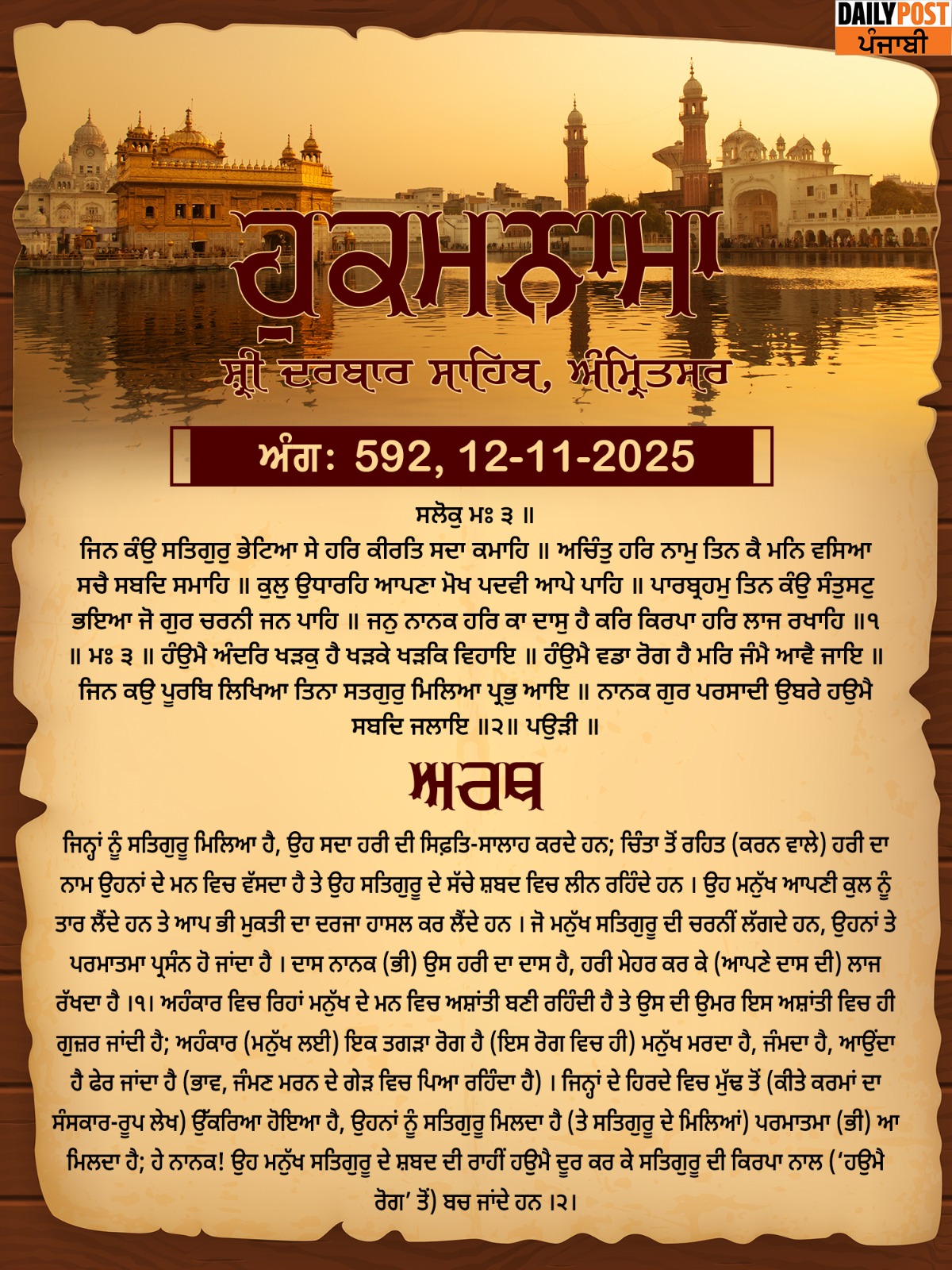 ਸ੍ਰੀ ਦਰਬਾਰ ਸਾਹਿਬ ਤੋਂ ਅੱਜ ਦਾ ਹੁਕਮਨਾਮਾ 12-11-2025
