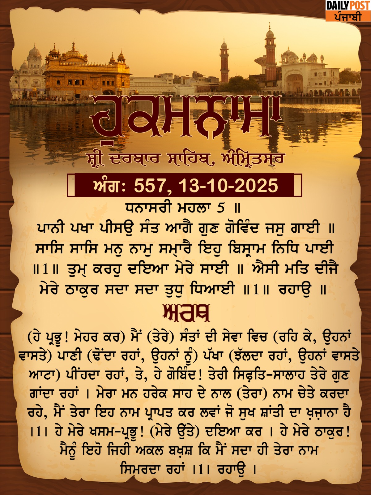 ਸ੍ਰੀ ਦਰਬਾਰ ਸਾਹਿਬ ਤੋਂ ਅੱਜ ਦਾ ਹੁਕਮਨਾਮਾ 13-10-2025