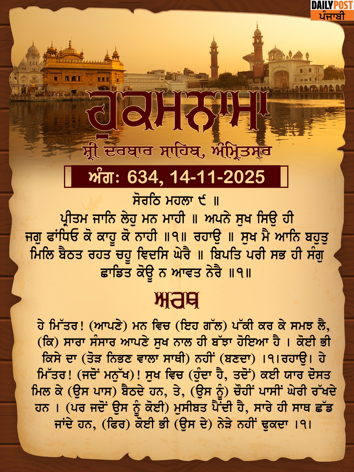 ਸ੍ਰੀ ਦਰਬਾਰ ਸਾਹਿਬ ਤੋਂ ਅੱਜ ਦਾ ਹੁਕਮਨਾਮਾ 14-11-2025