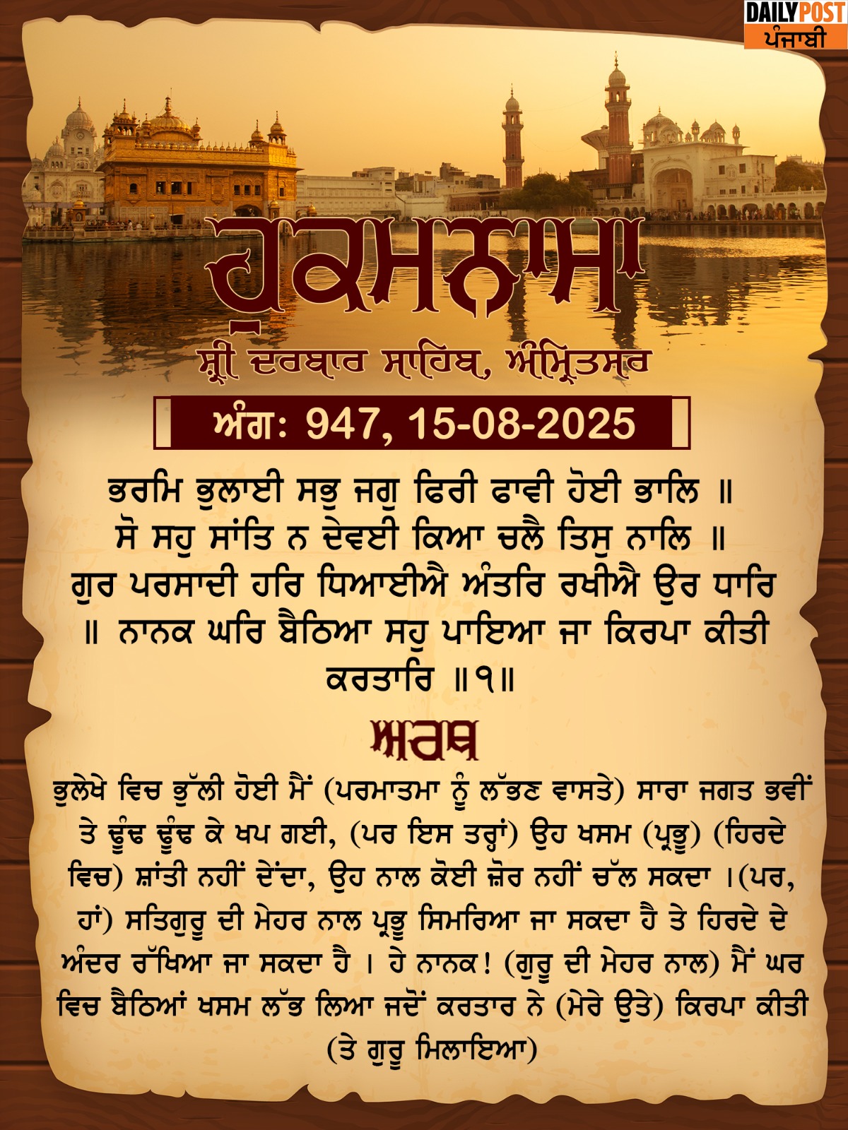 ਸ੍ਰੀ ਦਰਬਾਰ ਸਾਹਿਬ ਤੋਂ ਅੱਜ ਦਾ ਹੁਕਮਨਾਮਾ 15-8-2025