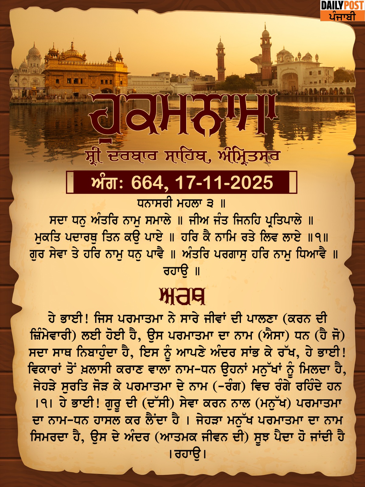 ਸ੍ਰੀ ਦਰਬਾਰ ਸਾਹਿਬ ਤੋਂ ਅੱਜ ਦਾ ਹੁਕਮਨਾਮਾ 17-11-2025