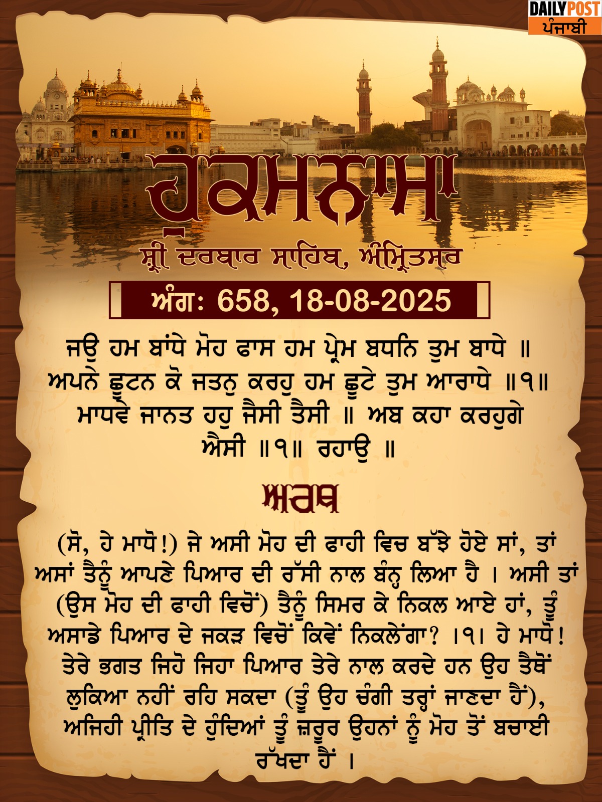 ਸ੍ਰੀ ਦਰਬਾਰ ਸਾਹਿਬ ਤੋਂ ਅੱਜ ਦਾ ਹੁਕਮਨਾਮਾ 18-8-2025