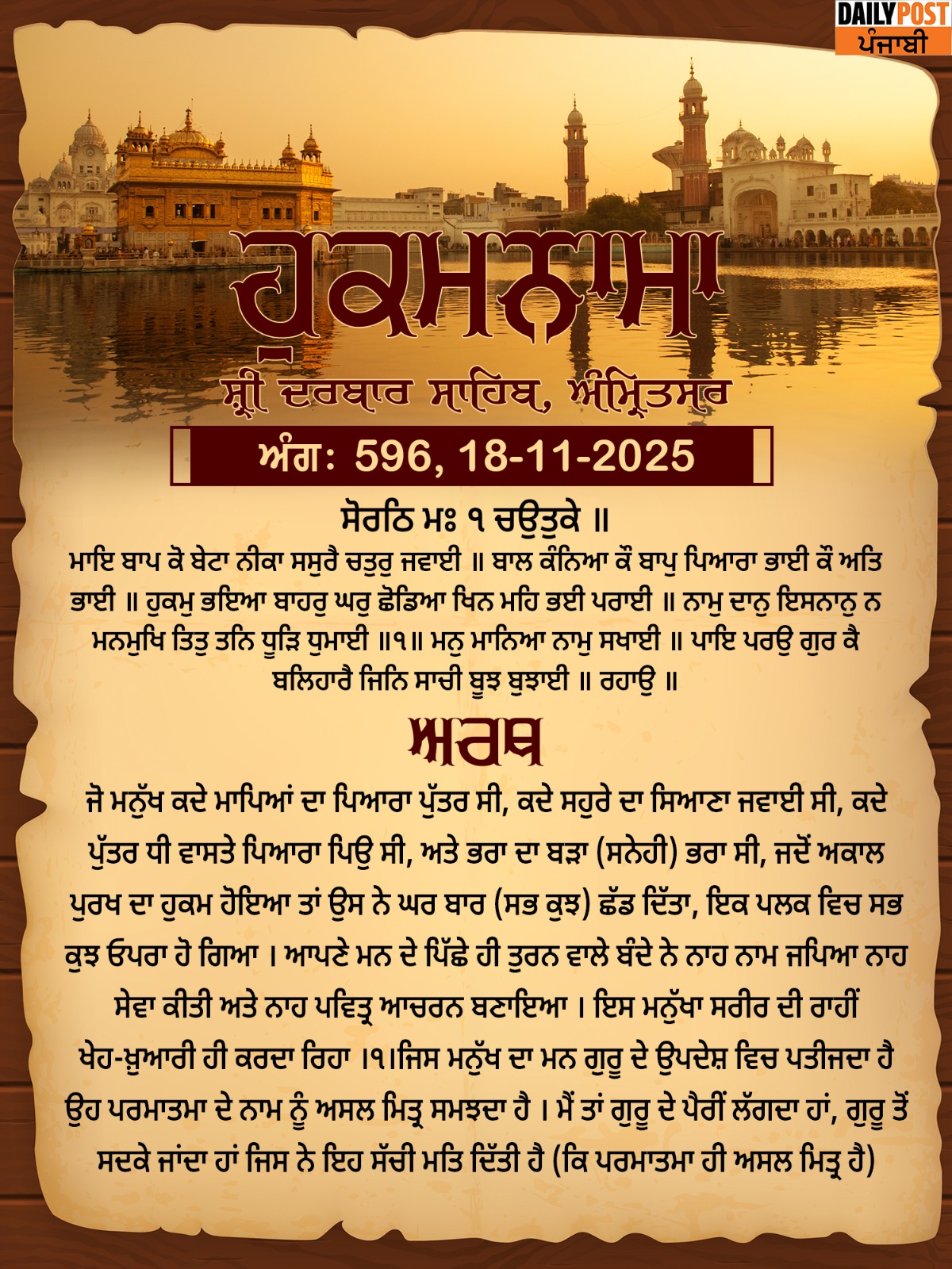 ਸ੍ਰੀ ਦਰਬਾਰ ਸਾਹਿਬ ਤੋਂ ਅੱਜ ਦਾ ਹੁਕਮਨਾਮਾ 18-11-2025