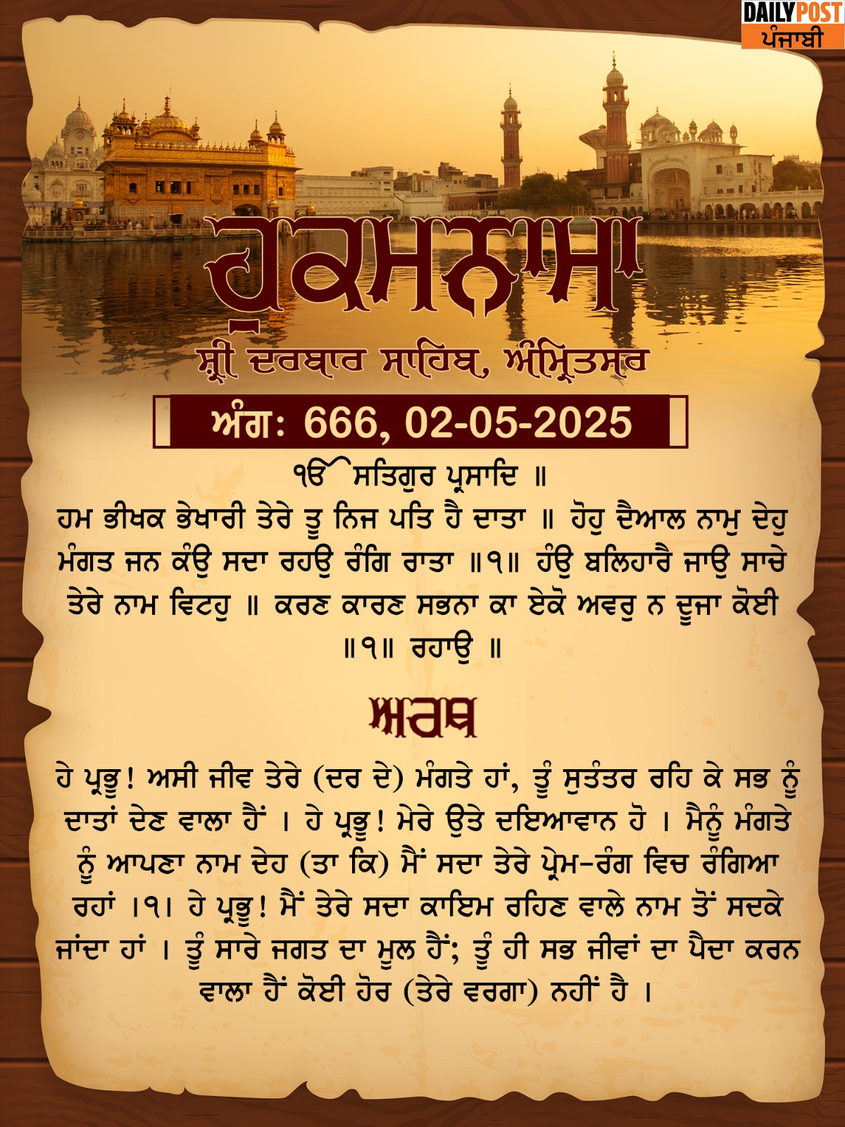 ਸ੍ਰੀ ਦਰਬਾਰ ਸਾਹਿਬ ਤੋਂ ਅੱਜ ਦਾ ਹੁਕਮਨਾਮਾ 2-5-2025