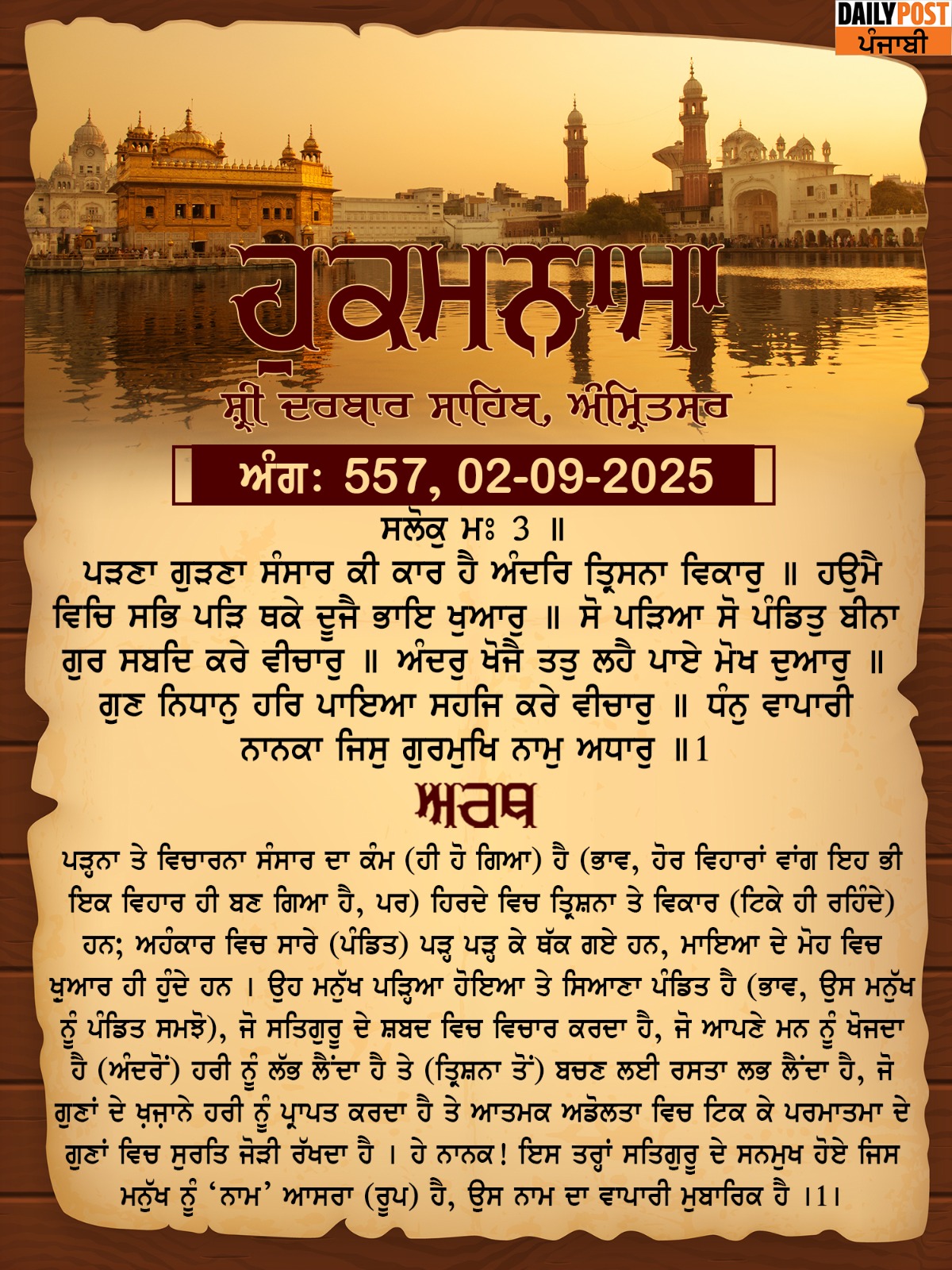 ਸ੍ਰੀ ਦਰਬਾਰ ਸਾਹਿਬ ਤੋਂ ਅੱਜ ਦਾ ਹੁਕਮਨਾਮਾ 2-9-2025