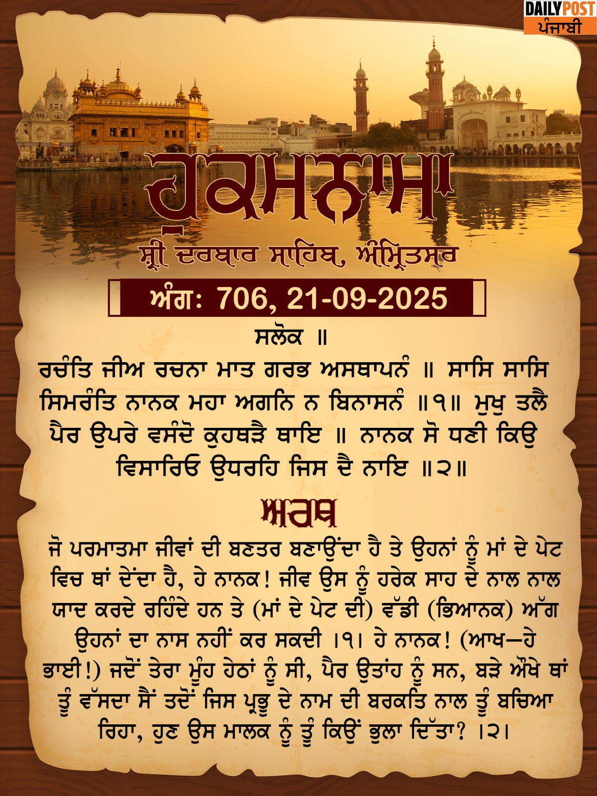 ਸ੍ਰੀ ਦਰਬਾਰ ਸਾਹਿਬ ਤੋਂ ਅੱਜ ਦਾ ਹੁਕਮਨਾਮਾ 21-9-2025