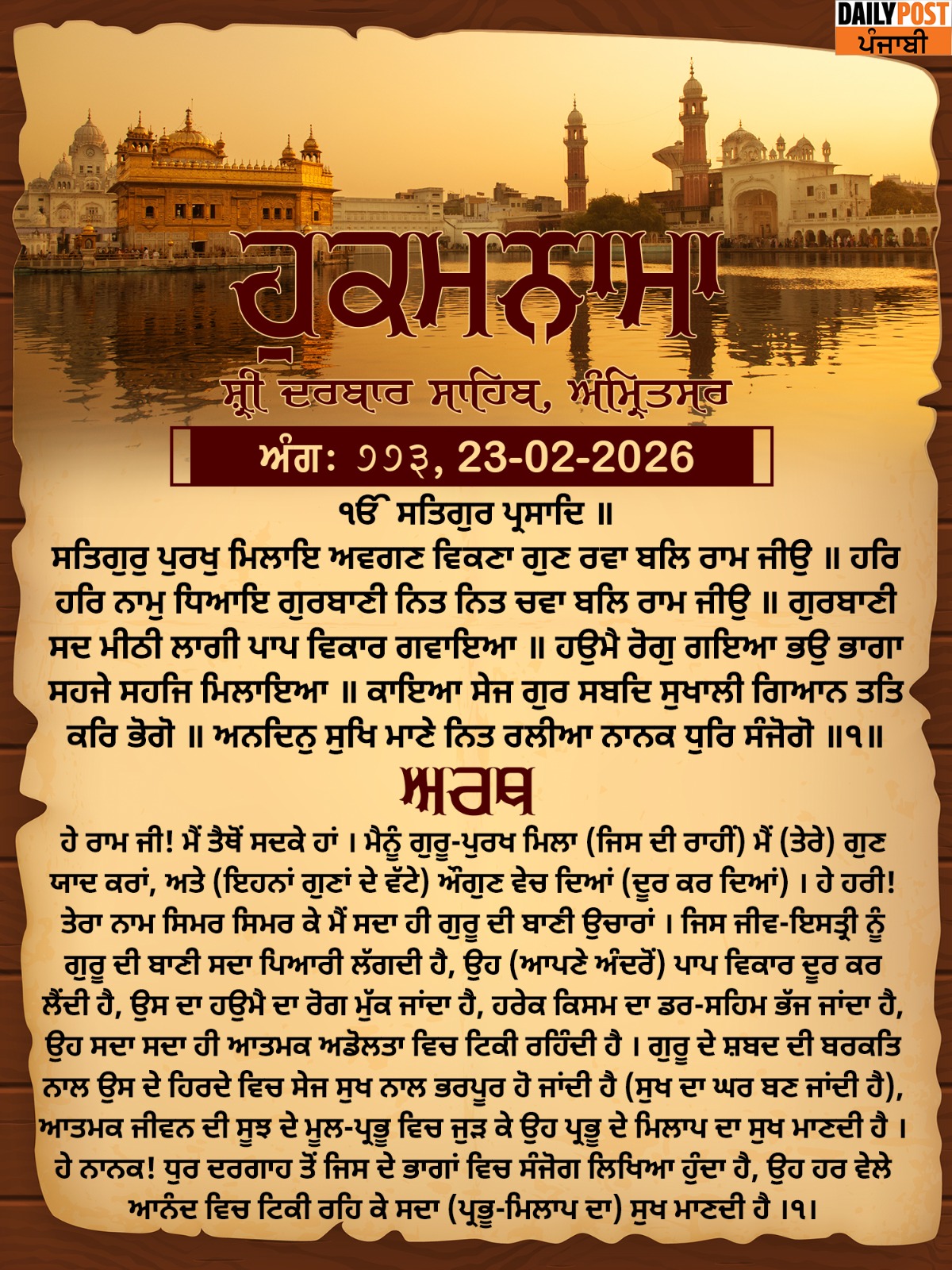 ਸ੍ਰੀ ਦਰਬਾਰ ਸਾਹਿਬ ਤੋਂ ਅੱਜ ਦਾ ਹੁਕਮਨਾਮਾ 23-2-2026