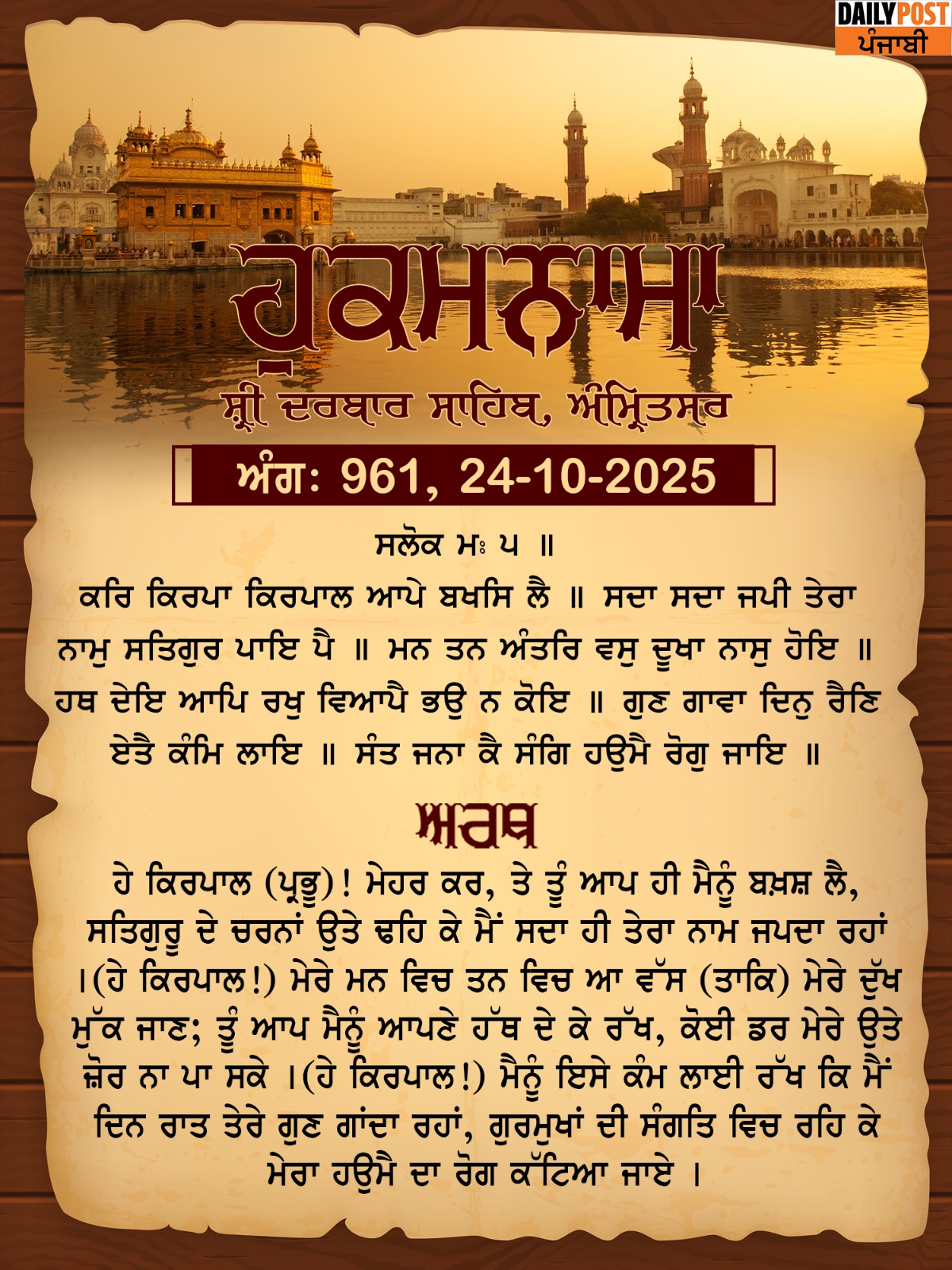 ਸ੍ਰੀ ਦਰਬਾਰ ਸਾਹਿਬ ਤੋਂ ਅੱਜ ਦਾ ਹੁਕਮਨਾਮਾ 24-10-2025