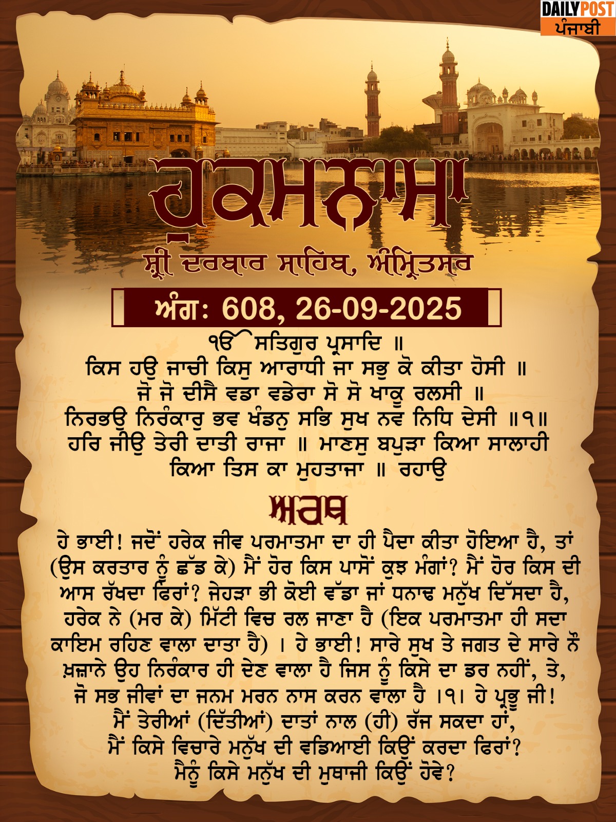 ਸ੍ਰੀ ਦਰਬਾਰ ਸਾਹਿਬ ਤੋਂ ਅੱਜ ਦਾ ਹੁਕਮਨਾਮਾ 26-9-2025