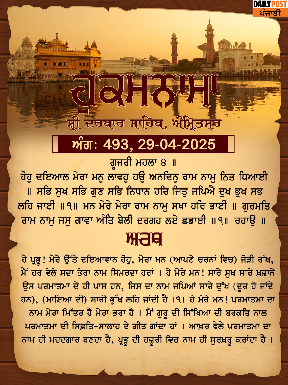 ਸ੍ਰੀ ਦਰਬਾਰ ਸਾਹਿਬ ਤੋਂ ਅੱਜ ਦਾ ਹੁਕਮਨਾਮਾ 29-4-2025