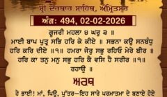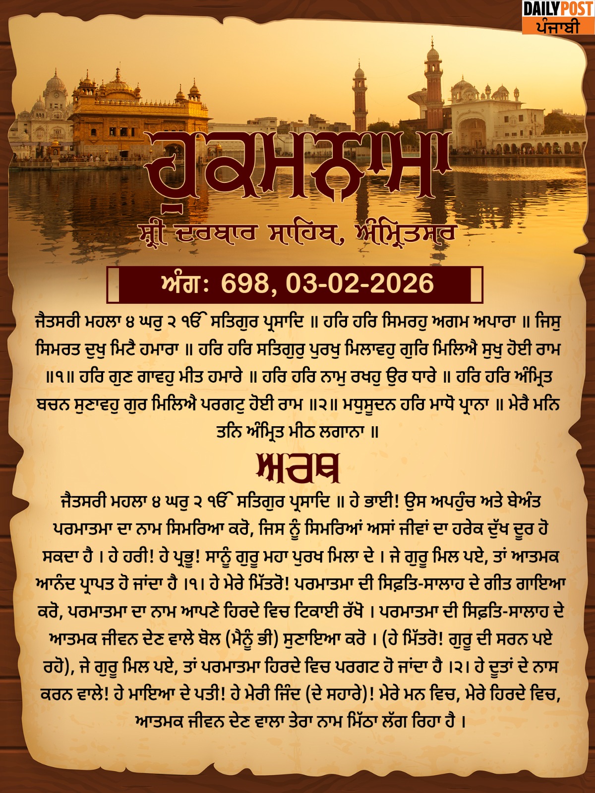 ਸ੍ਰੀ ਦਰਬਾਰ ਸਾਹਿਬ ਤੋਂ ਅੱਜ ਦਾ ਹੁਕਮਨਾਮਾ 3-2-2026