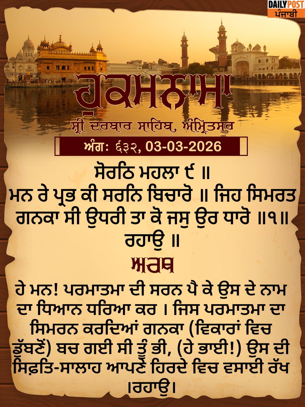 ਸ੍ਰੀ ਦਰਬਾਰ ਸਾਹਿਬ ਤੋਂ ਅੱਜ ਦਾ ਹੁਕਮਨਾਮਾ 3-3-2026