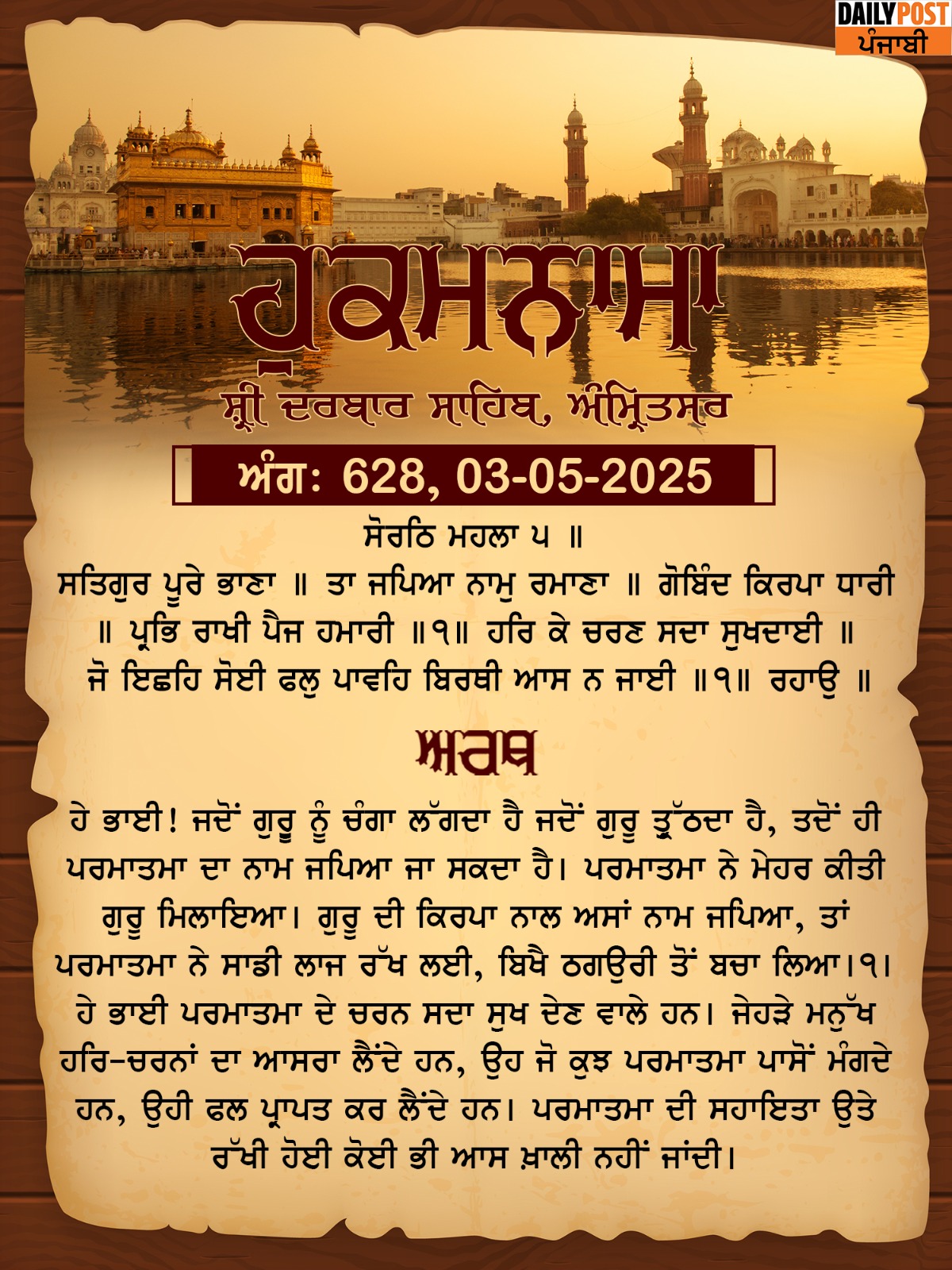 ਸ੍ਰੀ ਦਰਬਾਰ ਸਾਹਿਬ ਤੋਂ ਅੱਜ ਦਾ ਹੁਕਮਨਾਮਾ 3-5-2025