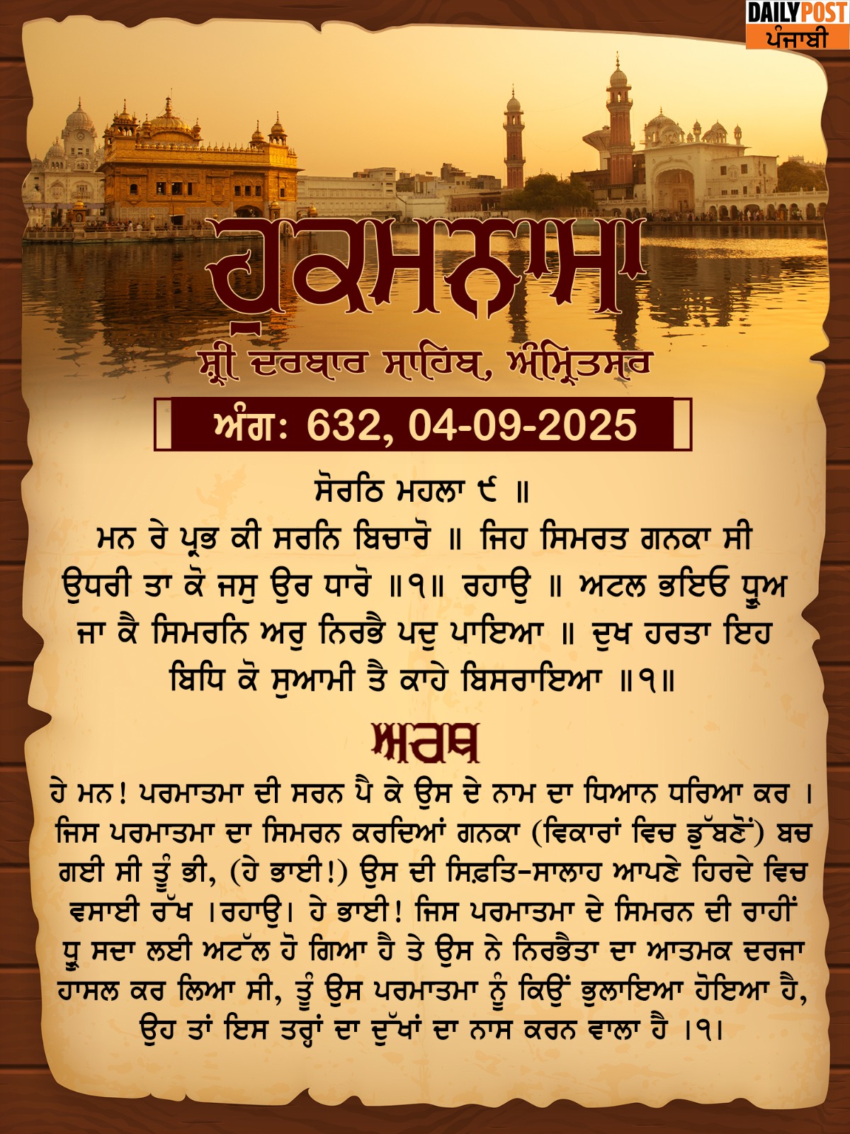 ਸ੍ਰੀ ਦਰਬਾਰ ਸਾਹਿਬ ਤੋਂ ਅੱਜ ਦਾ ਹੁਕਮਨਾਮਾ 4-9-2025