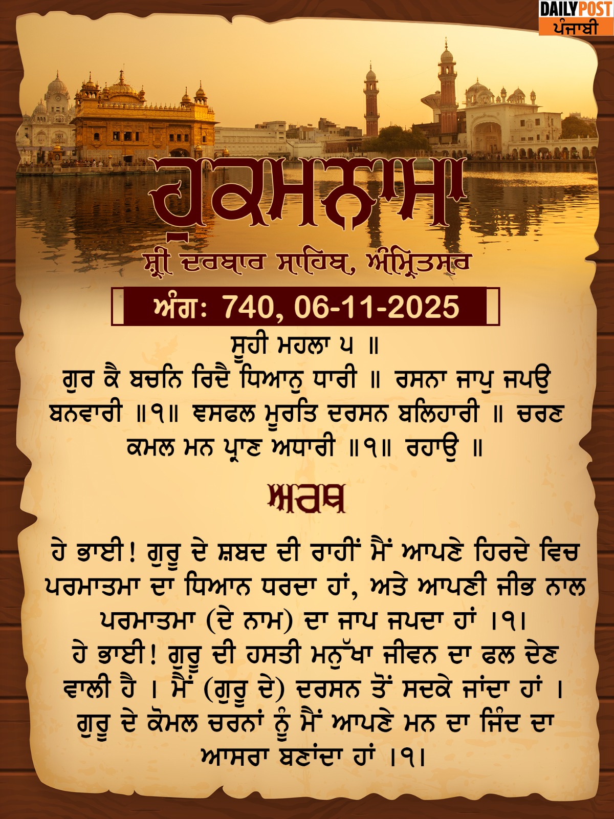 ਸ੍ਰੀ ਦਰਬਾਰ ਸਾਹਿਬ ਤੋਂ ਅੱਜ ਦਾ ਹੁਕਮਨਾਮਾ 6-11-2025